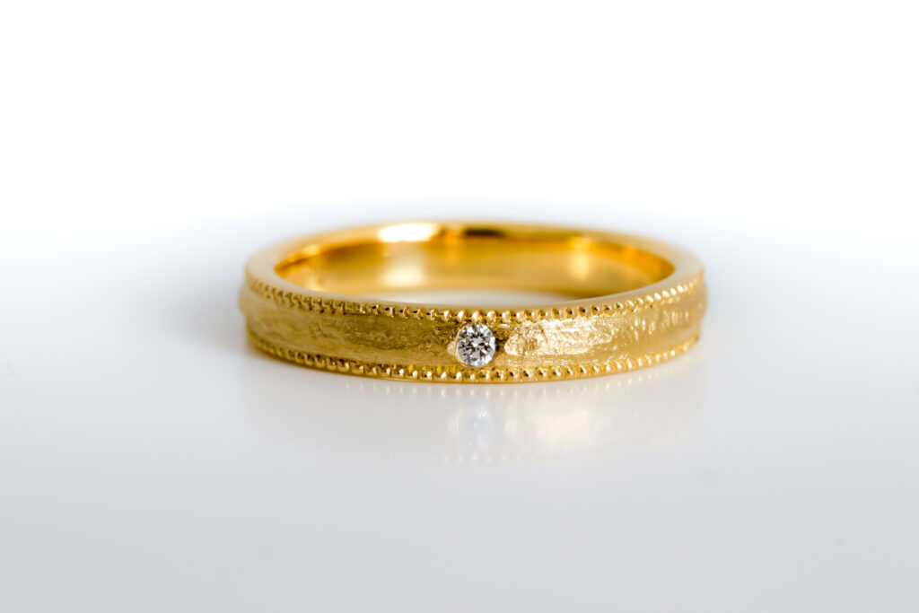 金属素材も着け心地に影響を与えます。柔らかく滑らかな金属素材(プラチナ、ゴールド)を選ぶことで、快適な着け心地を実現できます。また、デザインも考慮しましょう。突起やエッジのないシンプルなデザインの指輪が、着け心地を向上させます。ジゼットの結婚指輪や結婚指輪には、ミル打ち装飾(粒状の装飾)や、ダイヤモンドセットを行う爪にも丸みを帯びた仕上げを施すことで、着け心地の良いリングに仕上げています。