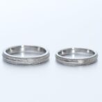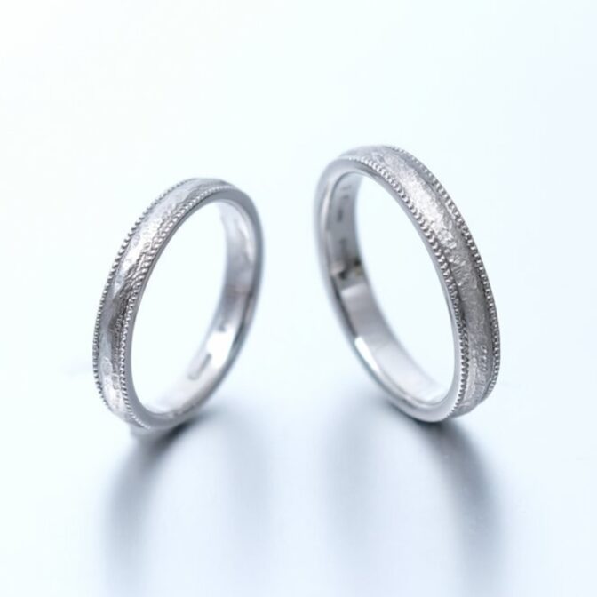 リング表面の緩やかなカーブをタガネで彫刻しアンティーク調の風合いに仕立てています。両脇には、「ミルグレイン」と呼ばれる装飾が繊細なきらめきを加えます。確かな存在感と繊細さをあわせ持つ、アンティーク調のマリッジリングです。指通りもとてもなめらかに仕上げています。